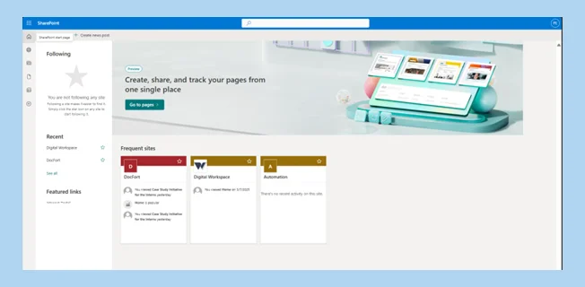 Once done with this process, you will be on the SharePoint landing page as shown below.